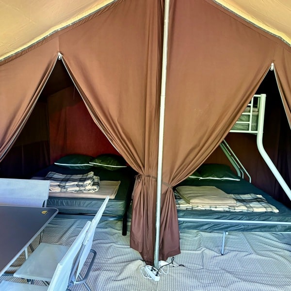 This comfortable tent has one bedroom with 1 double bed (160×190) and one bedroom with 1 single bed and 2 bunk beds (80×190). Blankets and pillows are provided (bed linen and towels are not included).